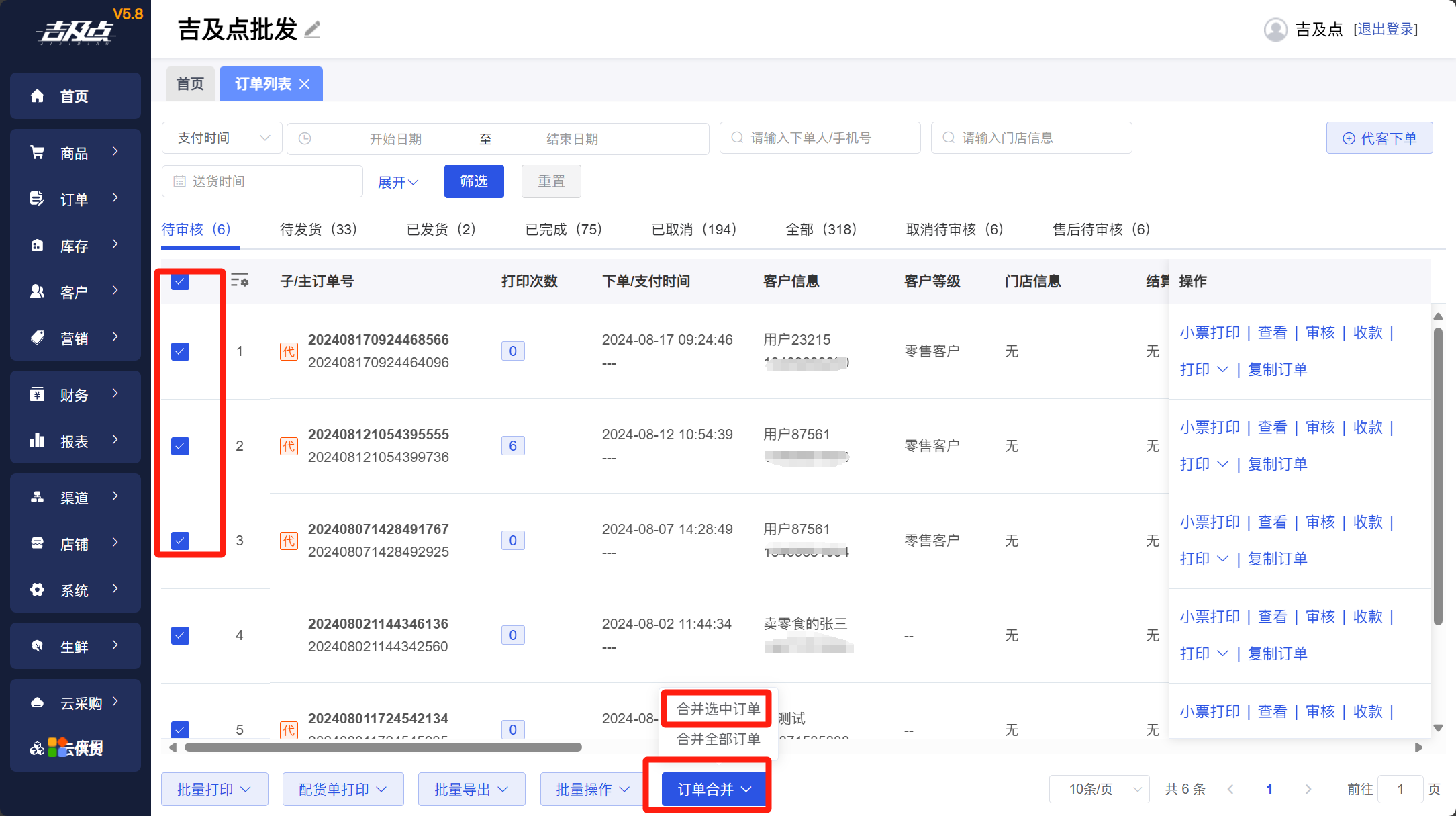 企业在处理多个订单时,通常面临如何整合订单信息、优化物流资源和减少重复操作的问题。吉及点订货系统的订单合并功能允许企业将来自同一客户的多个订单合并成一个进行处理。这一功能不仅减少了操作步骤,提高了工作效率,还能有效降低物流成本和库存压力,从而优化企业的整体运营流程。