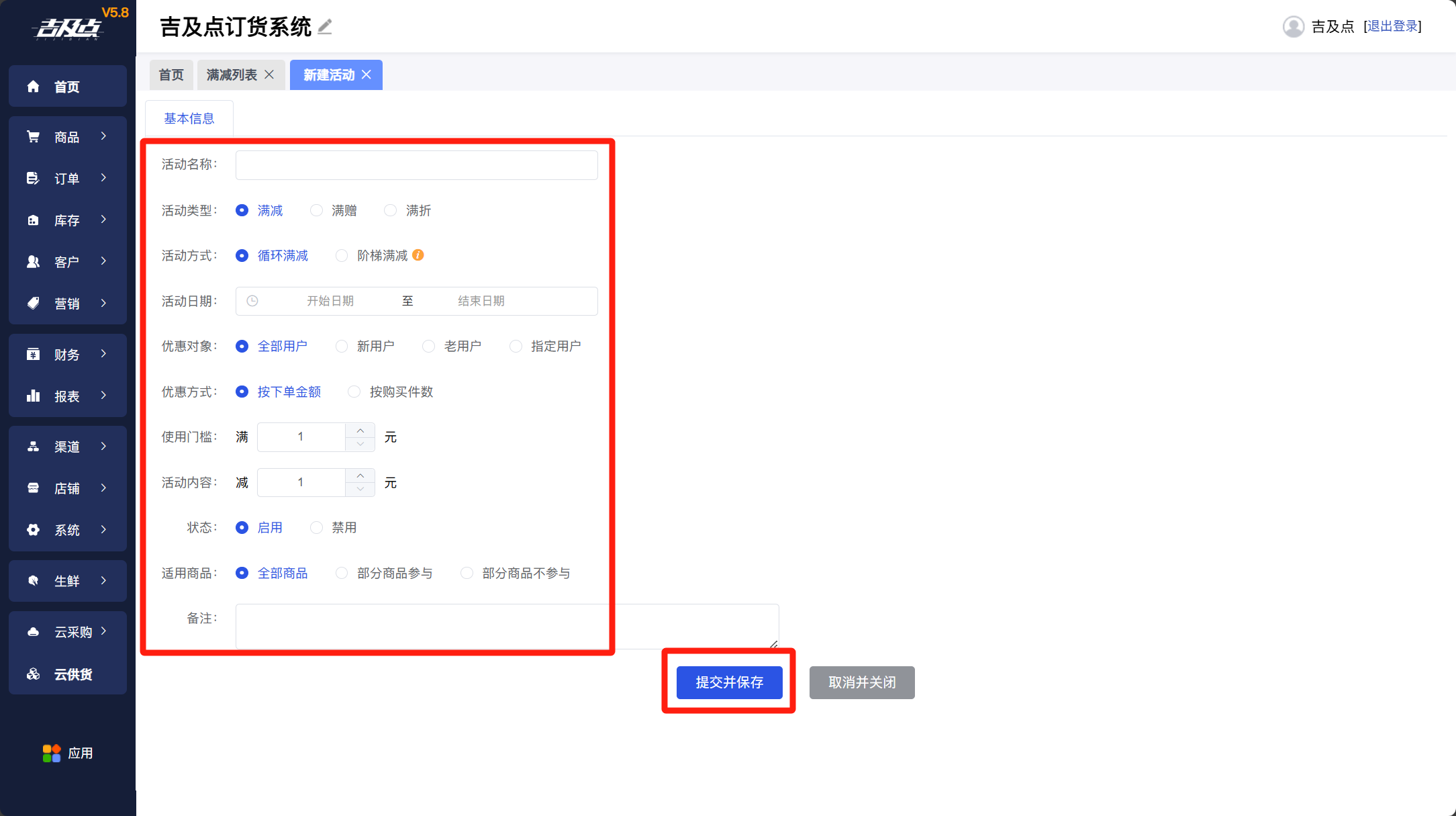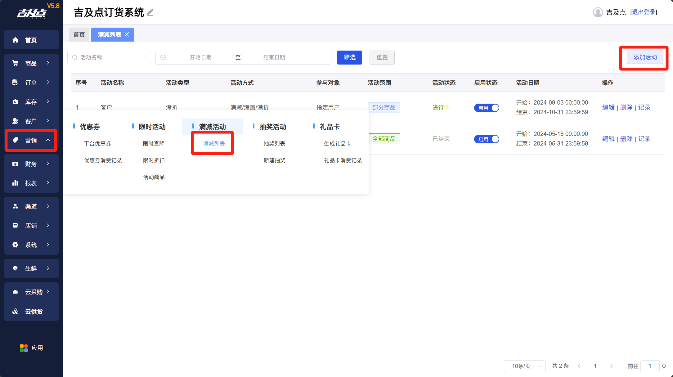 在吉及点订货系统的后台,左侧主菜单栏找到营销,选择满减列表,点击右上角的添加活动,填写好活动名称、活动时间等内容,然后点击保存即可。