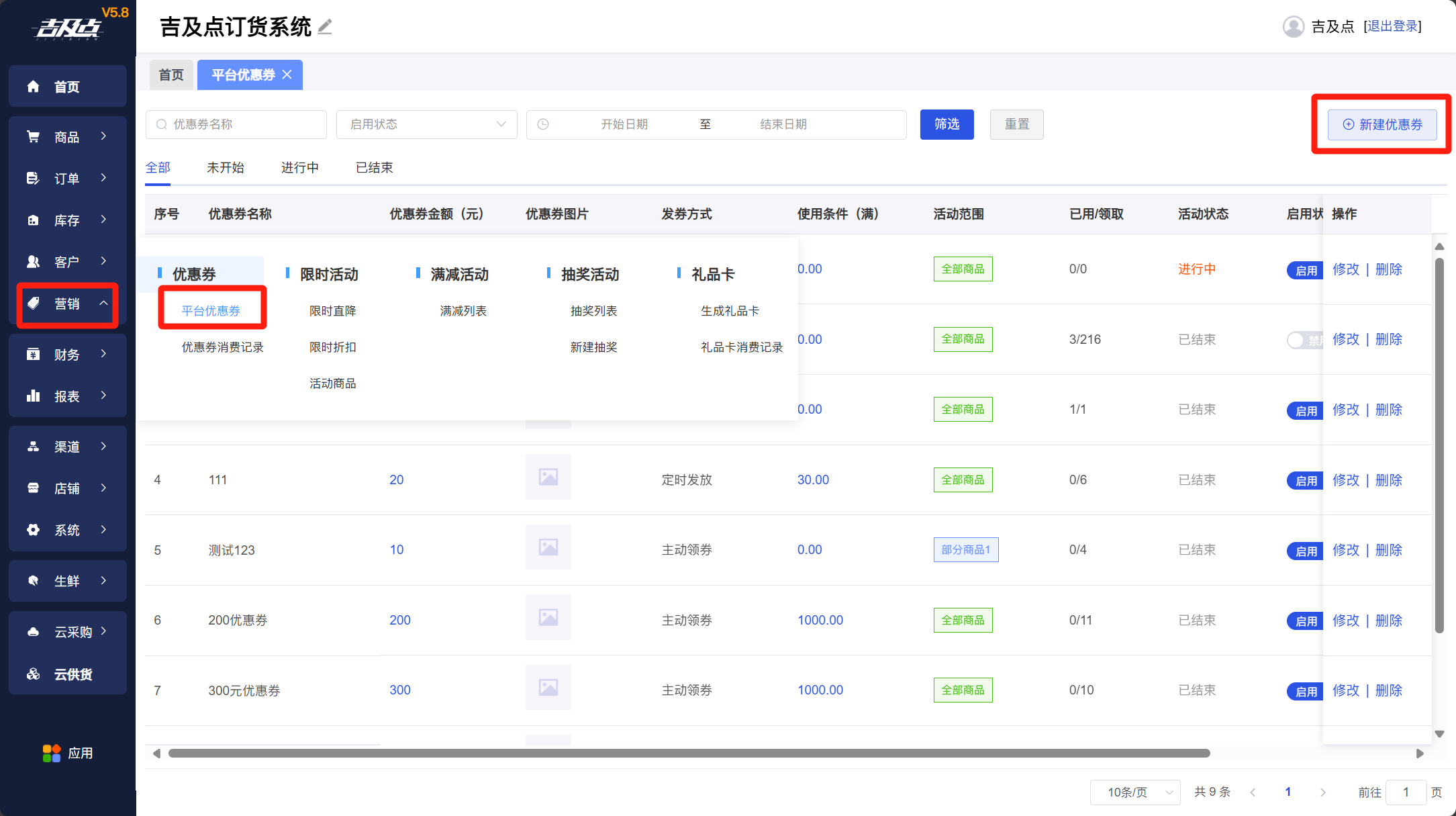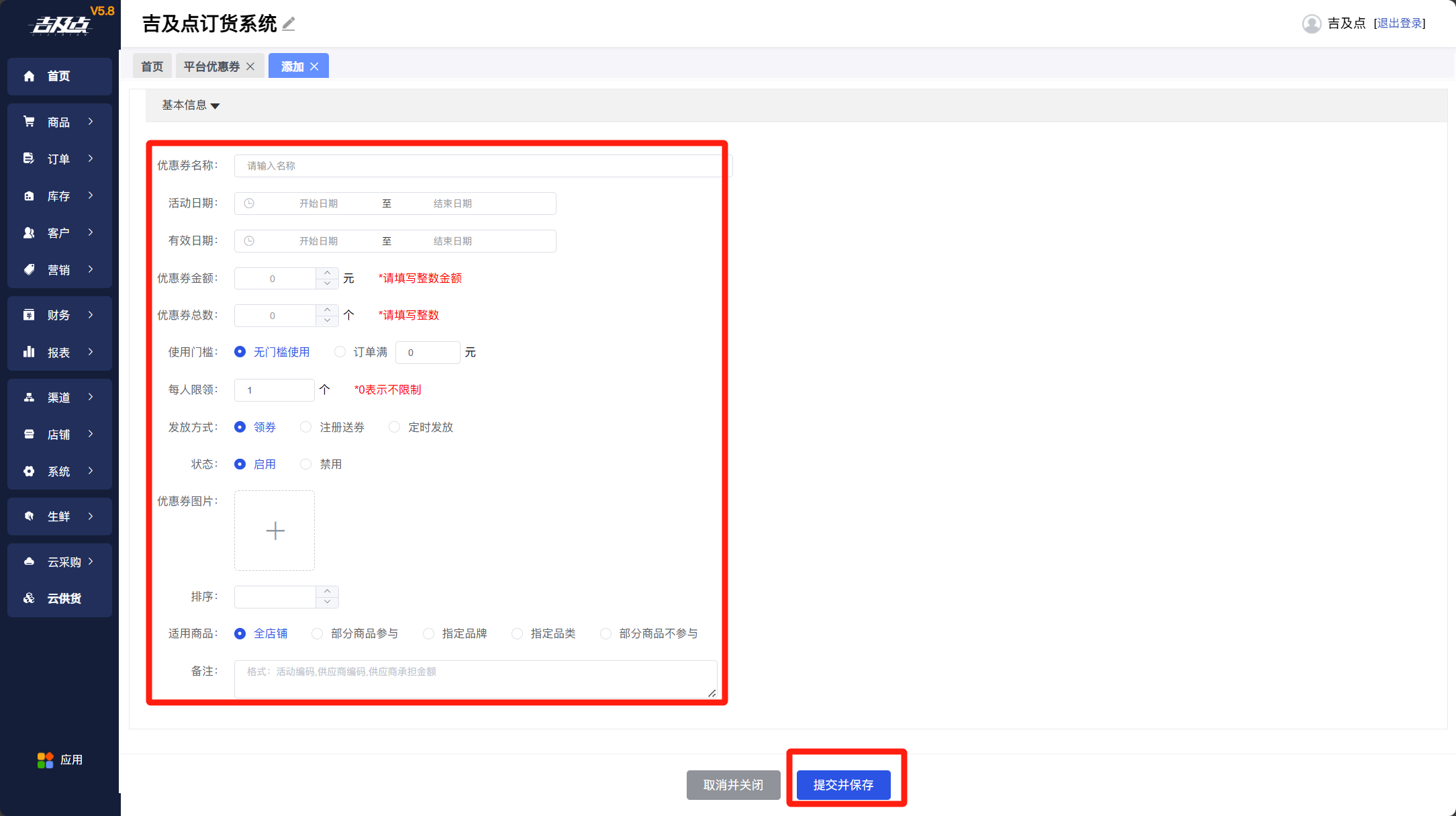 在吉及点订货系统电脑端后台选择营销,找到优惠券,点击右上角的添加优惠券按钮,然后按照实际情况填写内容,最后点击保存即可。