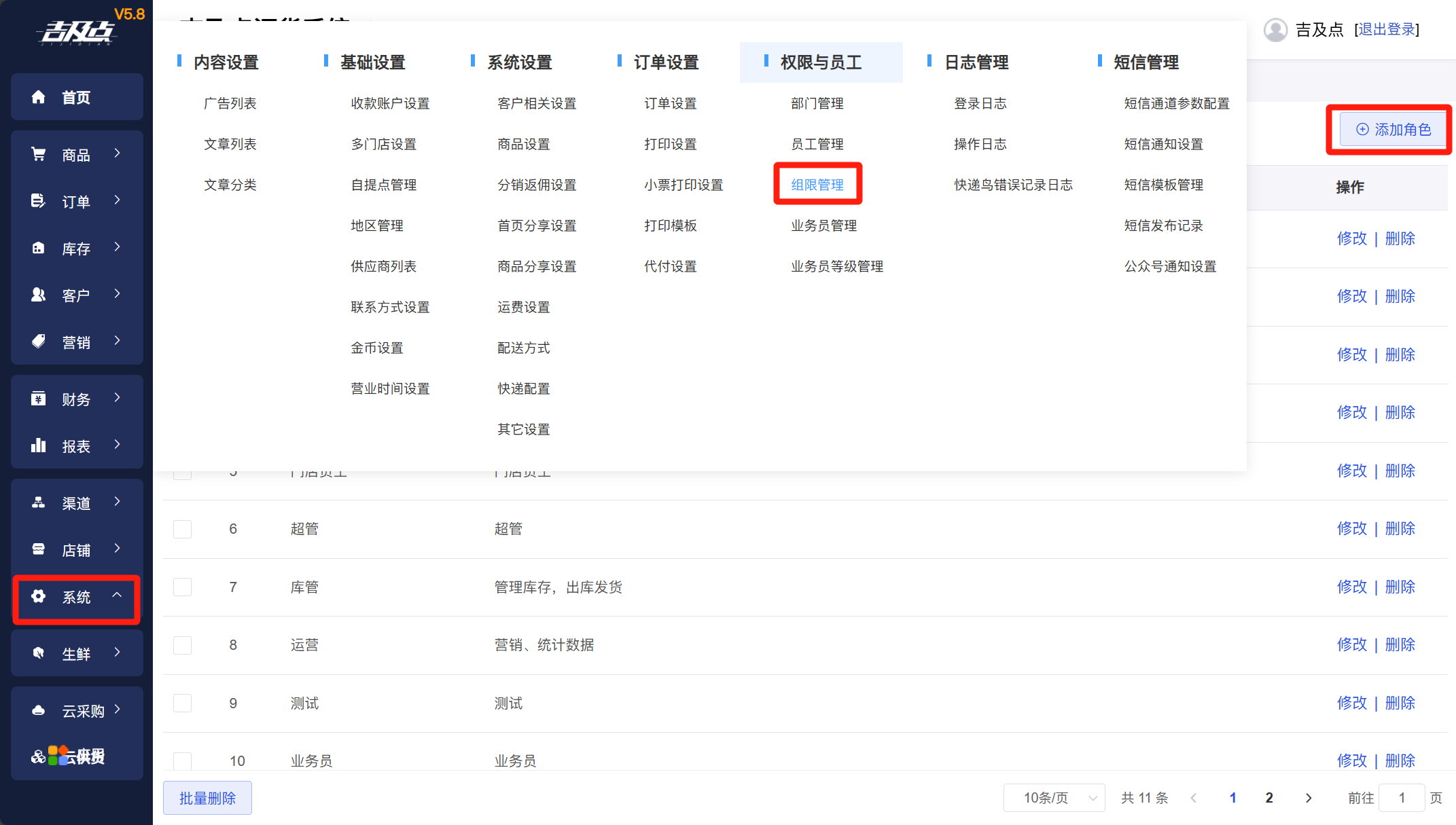 在吉及点订货系统中,设置员工管理前需要先设置每个角色的管理权限范围。首先点击主菜单栏中的系统,选择组限管理,点击添加角色,设置好用户组名称、用户组描述后,按照实际情况勾选对应管理权限,点击确认添加就可以了。