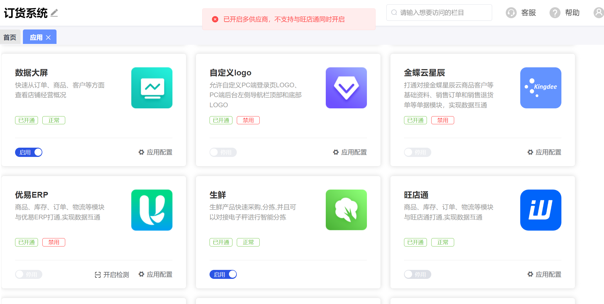 1.3开启旺店通必须关闭进销存、多商家、优易erp、金蝶、供应链(吉及采)。