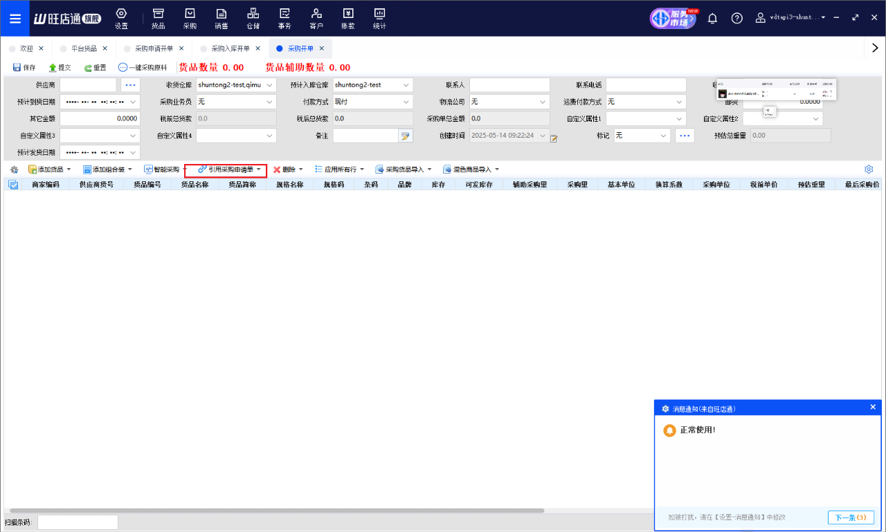 2.6采购-采购开单-引用采购申请单并提交。