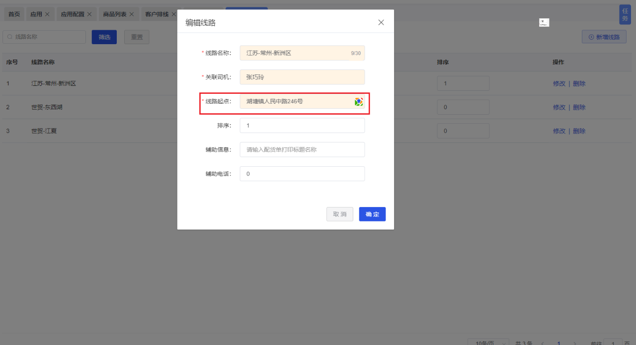 功能介绍:线路管理--新增编辑线路定位坐标和线路起点合并一行。