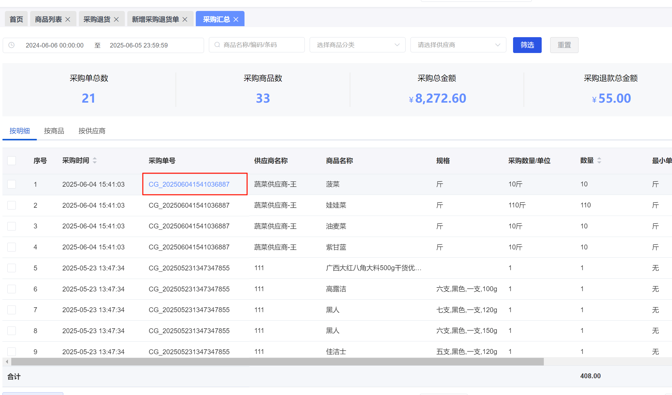 3.1采购汇总界面支持点击采购单号快捷跳转采购单详情页面。