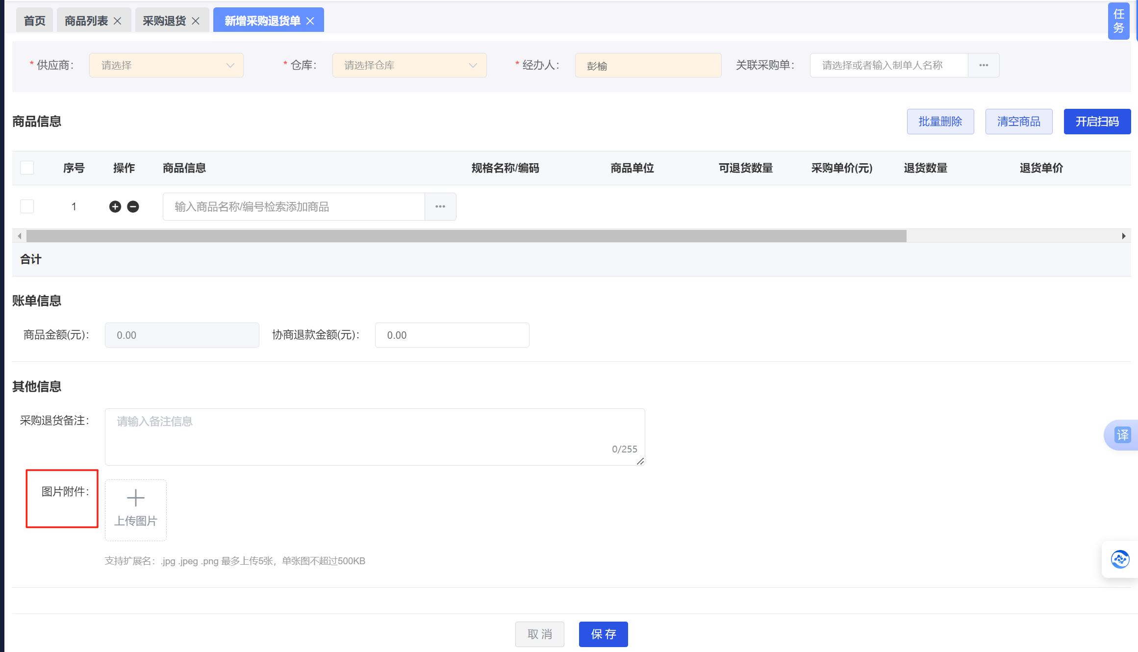 1.5采购退货单增加上传附件(五张)。
