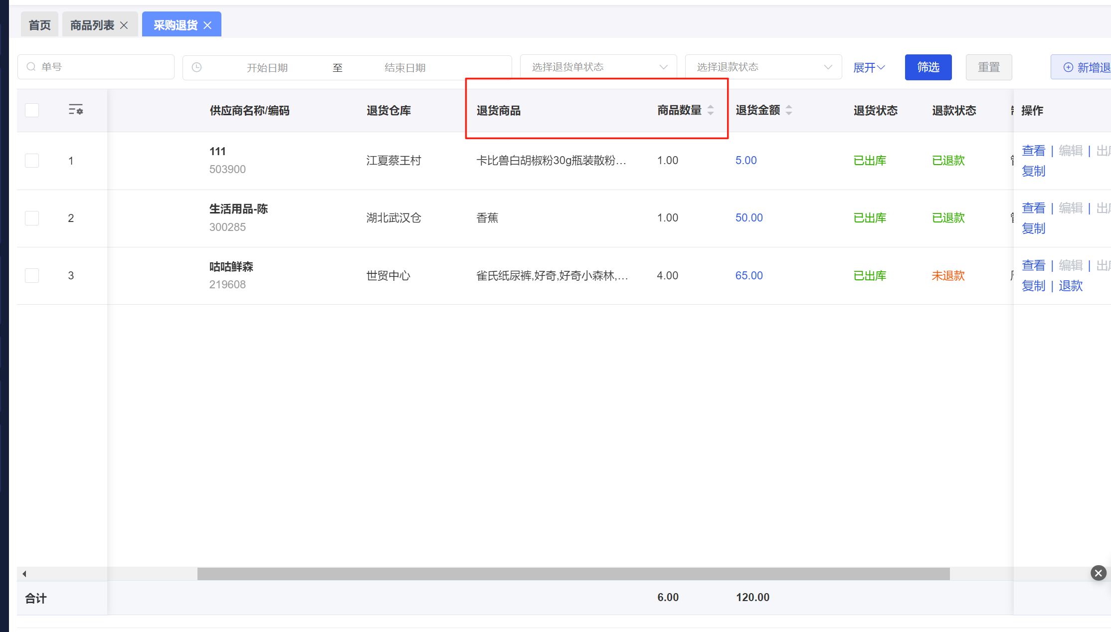 功能介绍:采购退货列表增加商品数量、退货商品字段。