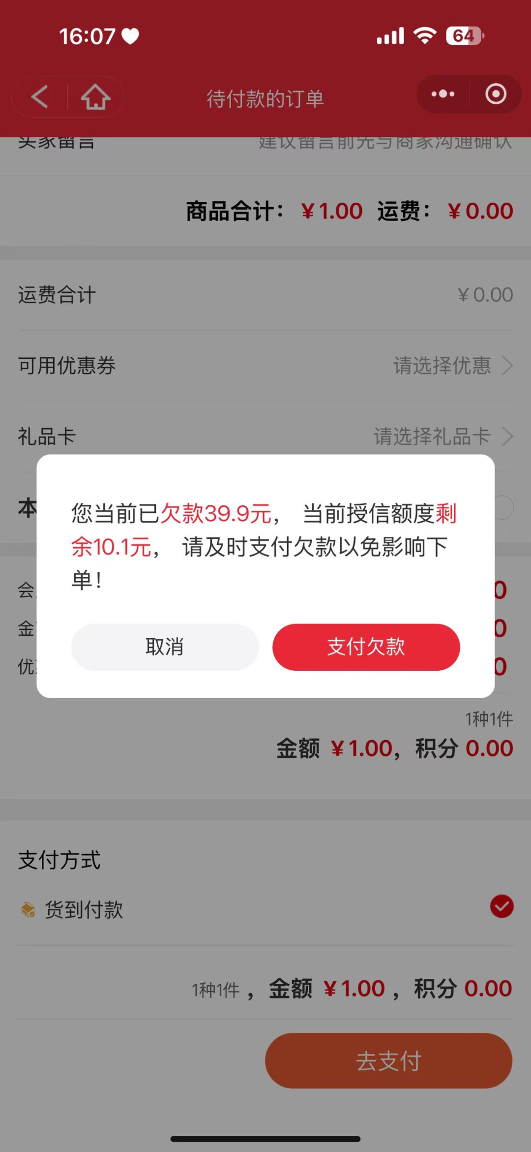 授信方式配置为总额度时。总额度用完 未支付欠款则无法下单、如配置为年、月、季度,额度用完则下一个月、季度、年会清空 可再次下单。