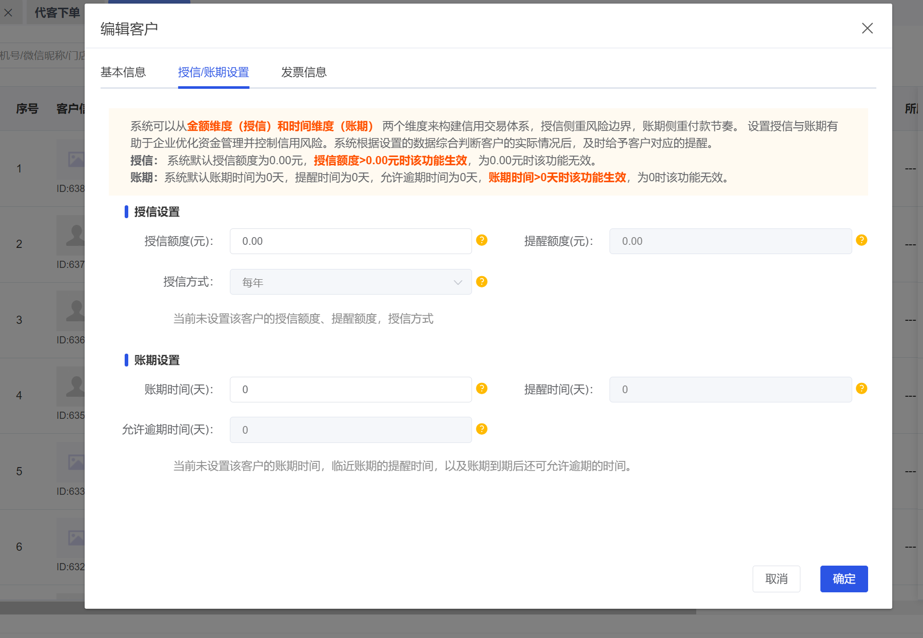 功能介绍:客户列表增加账期授信配置,如仅配置授信设置,则统计该客户历史未结算货到付款订单是否到达提醒额度或授信额度,如到达提醒额度则再次下单货到付款订单时会给出支付授信提醒、如可用额度已耗尽、则无法下单。