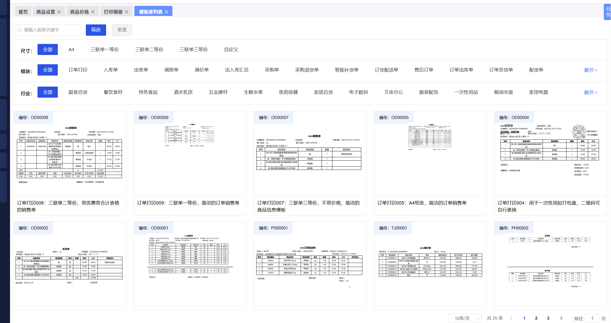 功能介绍:打印模板优化增加模板库,按照尺寸、行业、模块进行划分