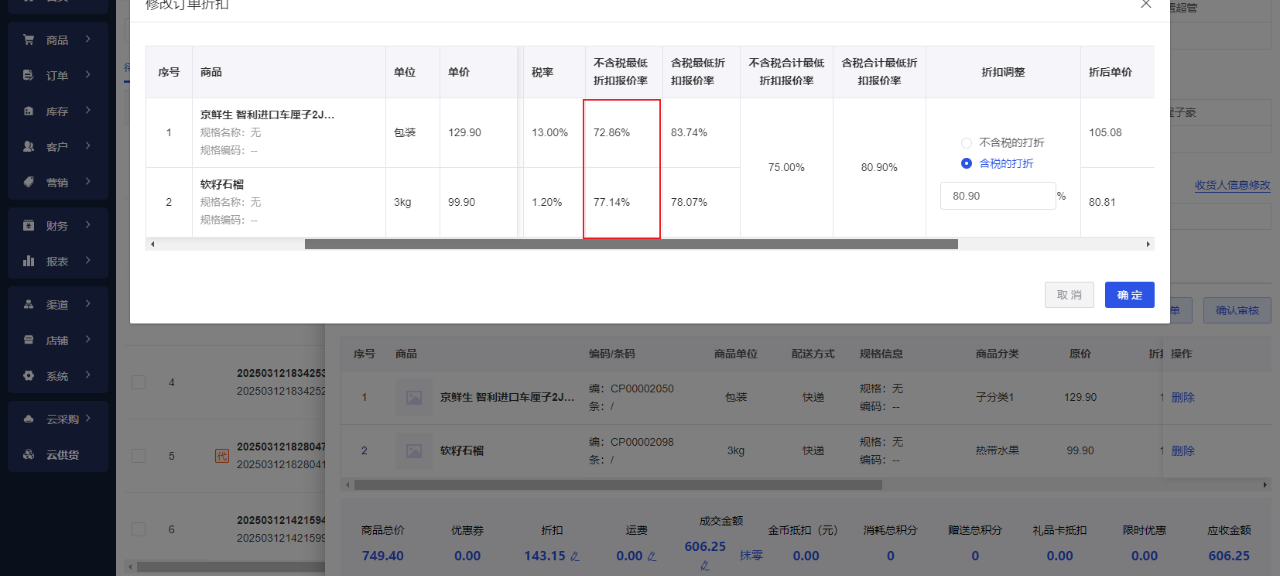 功能介绍:当商品设置开启折扣报价时,订单列表设置折扣率计算公式变更为商品种类折扣之和均值。