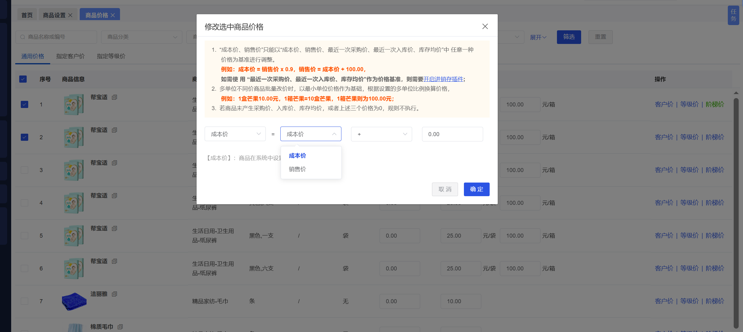 功能介绍:开启进销存插件时,批量修改价格时增加按照最近一次采购价、最近一次入库价、库存均价进行进行计算。