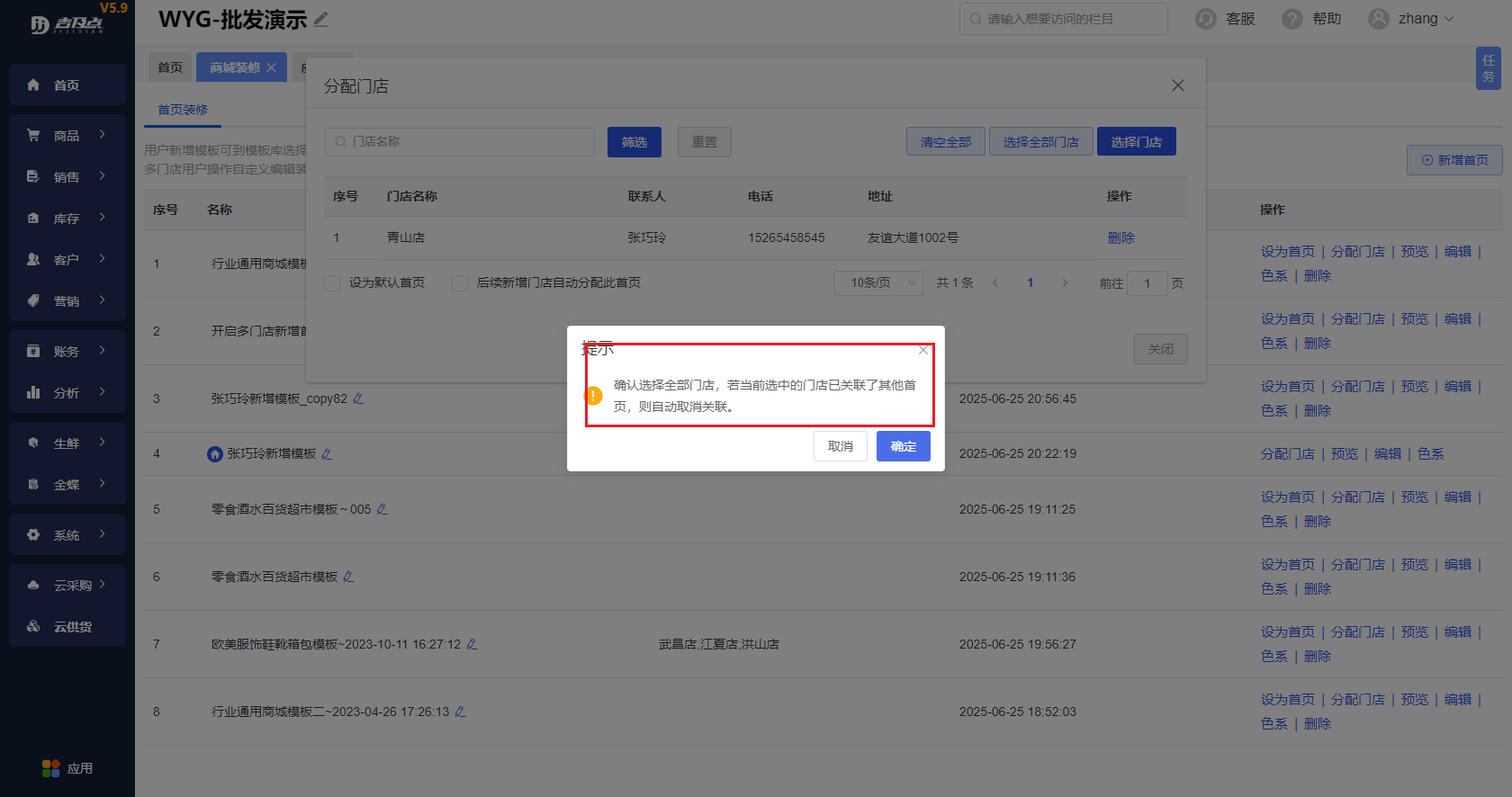 如果选择门店已绑定其他模板则点击确定后更换绑定模板
