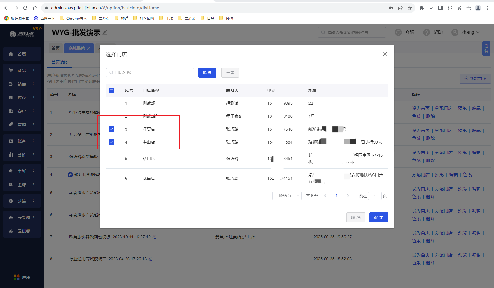 分配指定门店:则将选中门店绑定在当前模板下(可单选或多选)