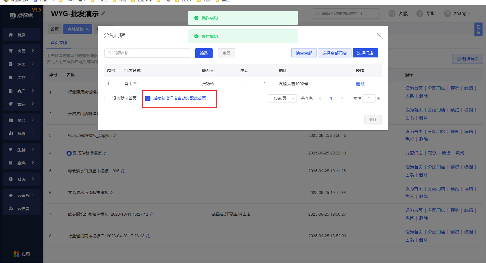 1.4 勾选后续新增门店自动分配首页则后续新增门店首页都展示为改模板样式、如取消勾选则后续新增门店按照默认首页样式展示