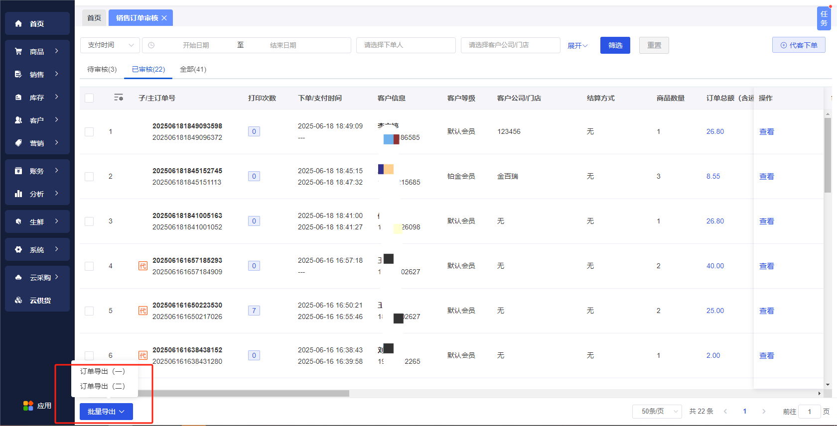 1.2销售订单审核-增加批量导出、仅支持订单导出一、订单导出二
