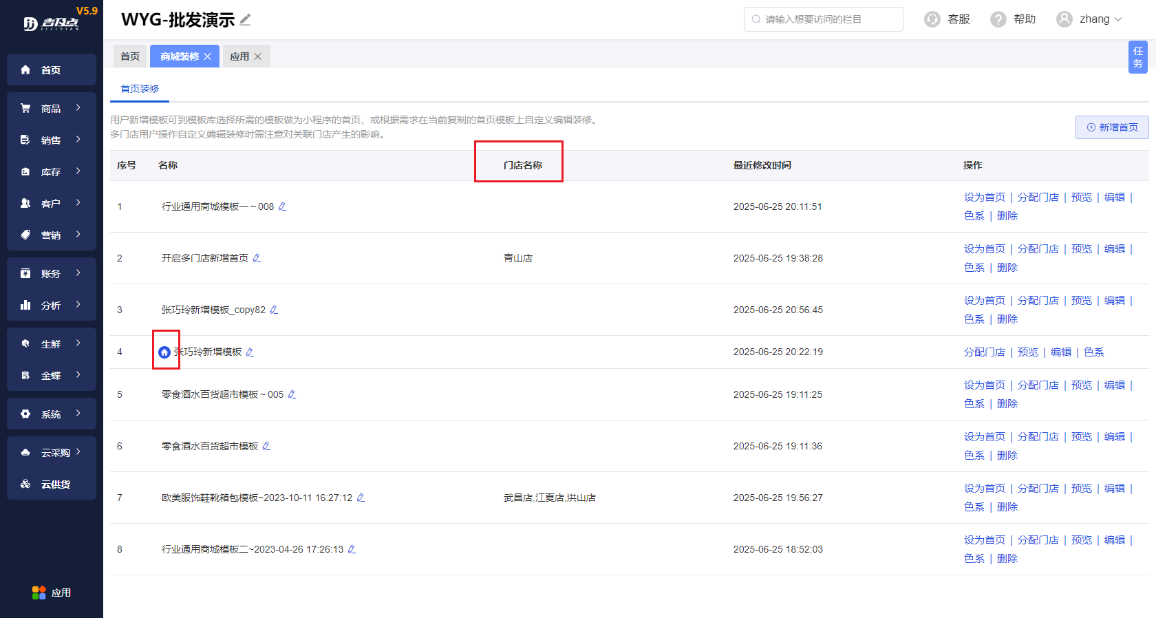 1.1未开启多门店插件商城装修页面显示、已设置默认首页增加首页标识,如设置其模板为默认首页则替换当前现有默认首页