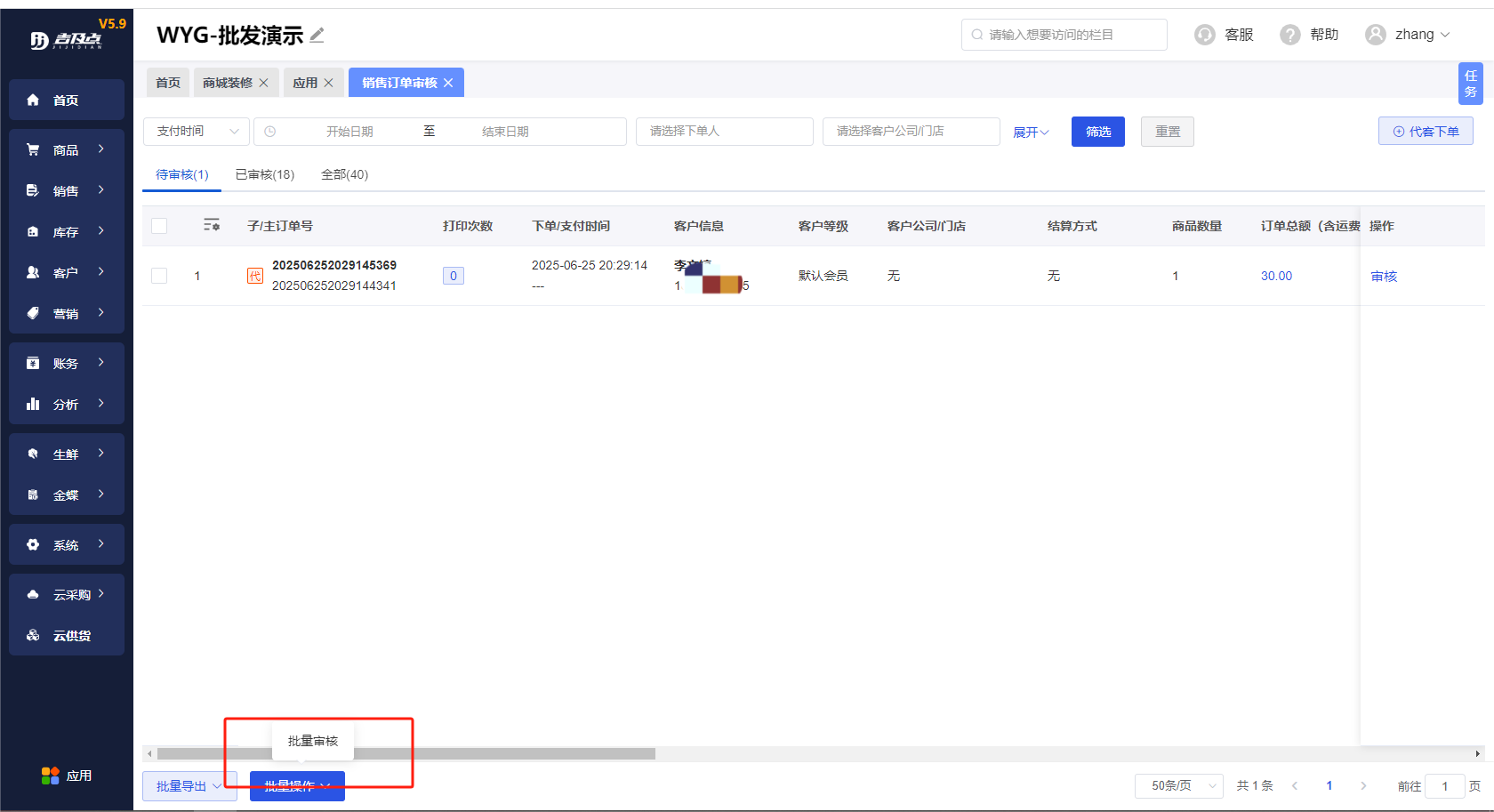 功能介绍:销售订单审核增加批量审核、批量导出功能1.1批量审核可一次操作多比待审核订单进行审核