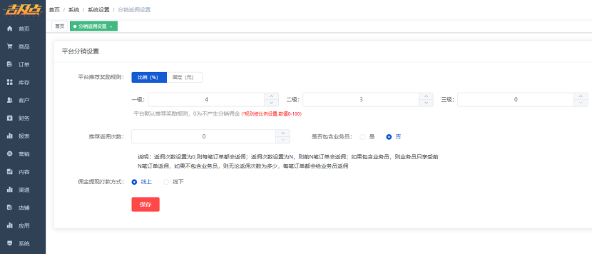 全部商品统一返佣:通过系统-分销返佣设置,对所有商品统一返佣。