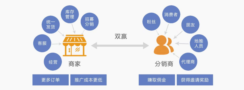[分销返佣],是通过老客户拓展新客户,通过佣金的形式给予老客户一定的报酬,从而刺激和鼓励老客户不断带来新客户的一种分销模式。