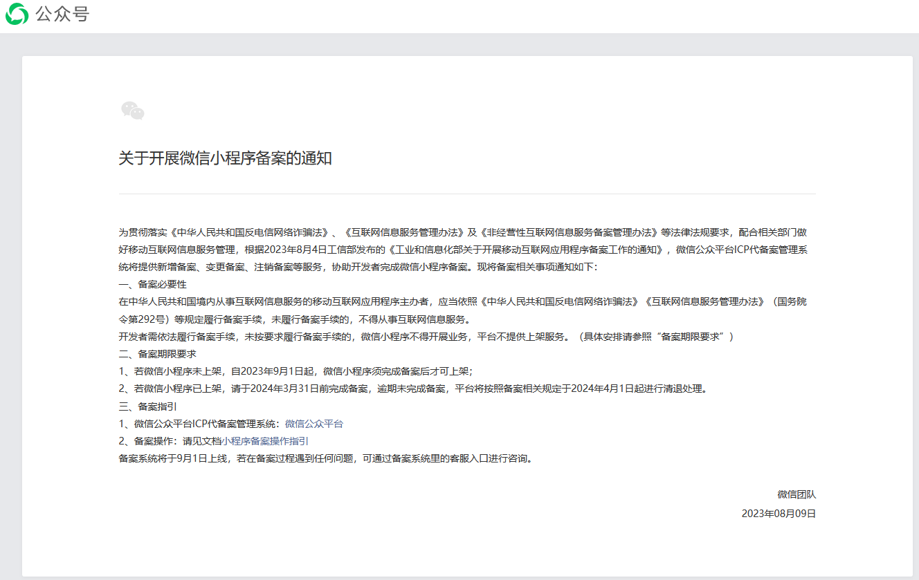 2、若微信小程序已上架,请于2024年3月31日前完成备案,逾期未完成备案,平台将按照备案相关规定于2024年4月1日起进行清退处理。