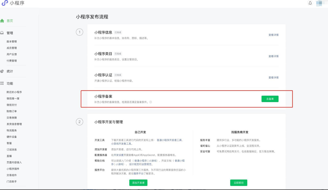 开发者可在小程序首页点击【去备案】即可进入备案流程