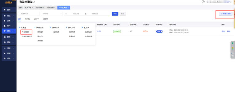 在吉及点订货系统电脑端后台选择营销,找到优惠券,点击右上角的添加优惠券按钮,然后按照实际情况填写内容,最后点击保存即可。